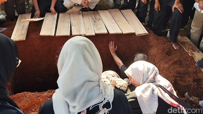 Terlihat para keluarga saling mengelus pundak masing-masing untuk saling menguatkan. Air mata mereka terus mengalir seiring proses pemakaman berjalan, terutama sang istri, Fitrie Nasution.