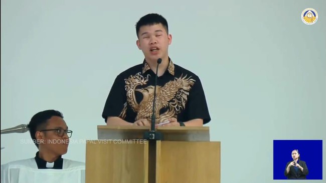 Saat Liturgi Sabda, seorang lektor akan membacakan sabda dari Alkitab dengan huruf Braille. Lektor yang bertugas dalam misa Paus Fransiskus di GBK ternyata seorang tunanetra.