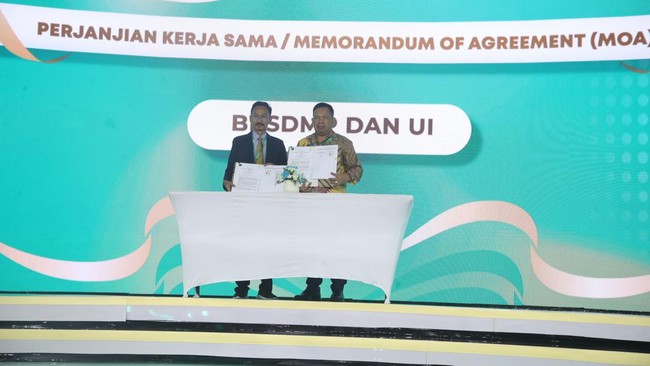 Penandatangan MoA dilakukan oleh Plt Wakil Rektor Bidang Akademik dan Kemahasiswaan UI, Dedi Priadi, dengan Kepala BPSDMP, Subagiyo. Keduanya mengabadikan momen dimulainnya kerja sama itu.