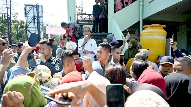 "Bapak, Ibu sekalian, assalamualaikum warahmatullahi wabarakatuh," ujar Jokowi memakai pelantang suara, dijawab warga yang mengerumuninya, seperti dikutip dari keterangan tertulis BPMI Setpres, Jumat (6/9).