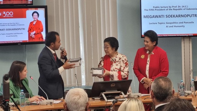 Seorang ilmuwan asal Indonesia, Gerry Utama, memberikan cendera mata berupa sampel batuan Antartika ke Ketua Umum PDIP Megawati Soekarnoputri saat kuliah umum di St Petersburg State University, Rusia. Megawati, yang merupakan Ketua Dewan Pengarah Badan Riset dan Inovasi Nasional (BRIN), menyampaikan harapan agar Gerry pulang ke RI.