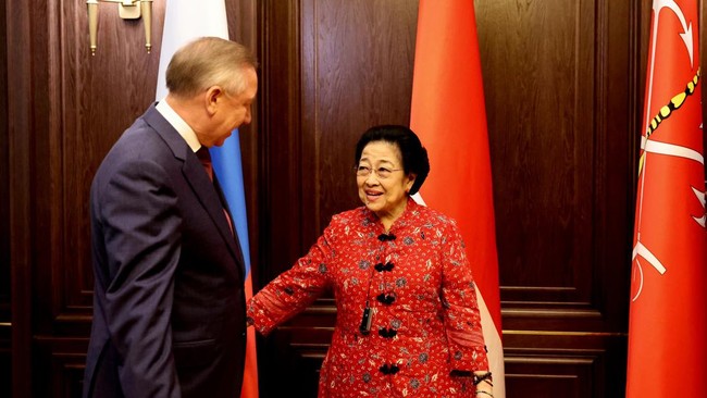 Presiden RI ke-5 sekaligus Ketua Umum PDIP, Megawati Soekarnoputri, menghadiri jamuan makan siang di kantor Gubernur St Petersburg Alexander Beglov. Megawati disambut langsung oleh Beglov.