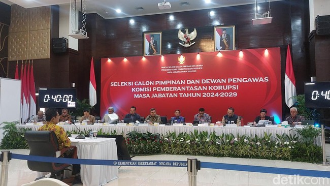 Pantauan detikcom, Rabu (18/9/2024), tes wawancara capim KPK digelar di Gedung Aula 3 Kementerian Sekretariat Negara. Ada 11 orang yang menjadi panelis.