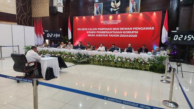 Pantauan detikcom, Kamis (19/9/2024), tes wawancara cadewas KPK digelar di Gedung Aula 3 Kementerian Sekretariat Negara. Ada 11 orang yang menjadi panelis, 2 orang diantaranya adalah panelis eksternal.