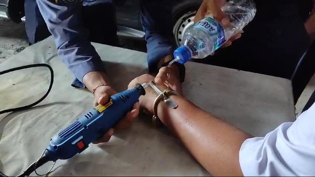 Borgol yang terpasang di pergelangan tangan remaja itu kemudian dipotong petugas Damkar menggunakan gerinda. Proses evakuasi berlangsung selama lima menit.