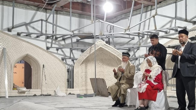 Megawati berdoa didampingi Ketua Kompleks Al Bukhari Dehqonboy Ermamato, penerjemah Maksud Khosimov dan Imam kehormatan kompleks Masjid Imam Al Bukhari Mahmudjon Ibodullaev. Megawati tampak mengangkat tangan sambil membacakan berdoa yang dibawakan Ibodullaev.