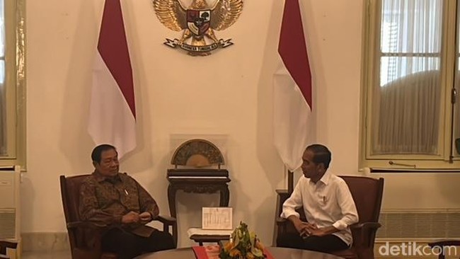 Presiden ke-6 RI Susilo Bambang Yudhoyono (SBY) menyambangi Presiden Joko Widodo (Jokowi) di Istana Negara, Jakarta. Pertemuan keduanya berlangsung tertutup.