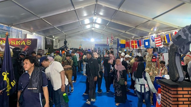 Pantauan detikcom di lokasi, Sabtu (21/9/2024), pukul 13.25 WIB, stan berisi peralatan perang bersifat ringan milik TNI AL berada dalam satu tenda tertutup. Pada stan tersebut, warga akan menemukan Bendera Lencana Perang saat memasuki pintu masuk.