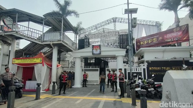 Komisi Pemilihan Umum Daerah (KPUD) DKI Jakarta akan menetapkan pasangan calon (paslon) gubernur dan wakil gubernur yang nantinya berkontestasi di Pilkada Jakarta 2024. Saat ini, sejumlah aparat kepolisian menjaga ketat area kantor KPUD Jakarta di Salemba, Jakarta Pusat.