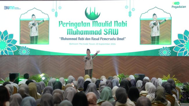 PT Pegadaian melalui Unit Usaha Syariah bersama Rohani Islam (ROHIS) Kantor Pusat menggelar peringatan Maulid Nabi Muhammad SAW 1446 H di Ballroom The Gade Tower, Jakarta, Senin (23/9/2024). Acara tersebut mengusung tema 'Muhammad Nabi dan Rasul Pemersatu Umat'.