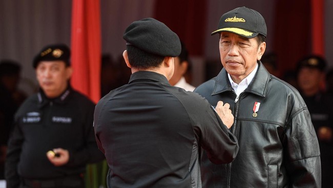 Presiden Joko Widodo (Jokowi) menerima Brevet Kehormatan Hiu Kencana dalam upacara yang digelar di atas KRI dr. Radjiman Wedyodiningrat (RJW-992). Tanda kehormatan itu diserahkan langsung oleh Panglima TNI Jenderal Agus Subiyanto.