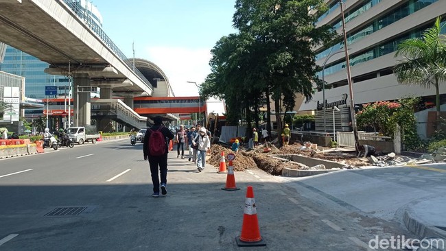 Pantauan detikcom, Senin (30/9/2024) pukul 14.45 WIB, galian itu terletak tepat di sebelah utara Stasiun LRT Kuningan. Terlihat proyek galian membentang sepanjang sekitar 30 meter.