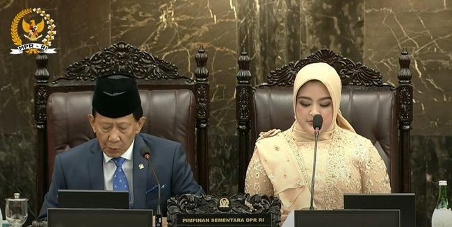 "Kami umumkan pimpinan sementara DPR RI adalah sebagian berikut: satu, Ketua sementara Saudara Guntur Sasono, Partai Demokrat, Dapil Jatim VIII. Dua, Wakil Ketua sementara Saudari Annisa Mahesa, Partai Gerindra, Dapil Banten II," tambahnya.