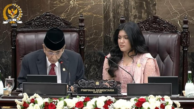 "Pemimpin sementara MPR RI sesuai dengan ketentuan tersebut adalah Ketua MPR Guntur Sasono, usia 78 tahun 2 bulan 30 hari, Partai Demokrat, Dapil Jatim VIII. Wakil Ketua Sementara MPR Larasati Moriska, usia 22 tahun 8 bulan 0 hari, Kalimantan Utara," imbuhnya.