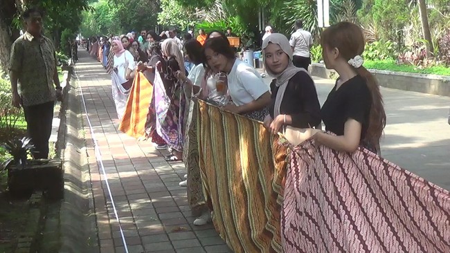 Pantauan detikcom, tampak kain batik itu dibentangkan sepanjang pedestrian kawasan Sistem Satu Arah (SSA) atau lingkar Istana dan Kebun Raya Bogor. Warga terlihat berbaris sambil memegang kain batik.