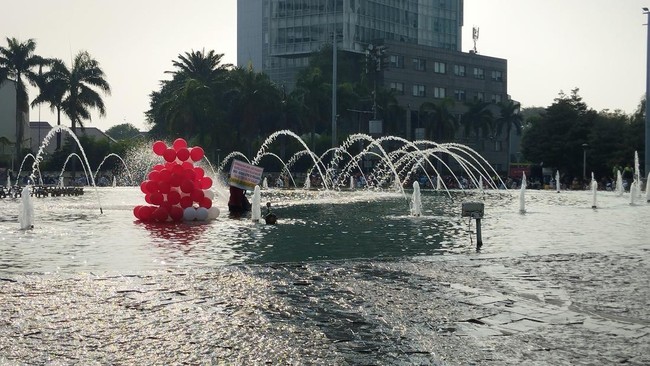 Pantauan detikcom di lokasi, Minggu (6/10), pria tersebut mengenakan baju berwarna merah. Dia menceburkan diri dan terlihat berenang ke arah tengah kolam Bundaran HI.
