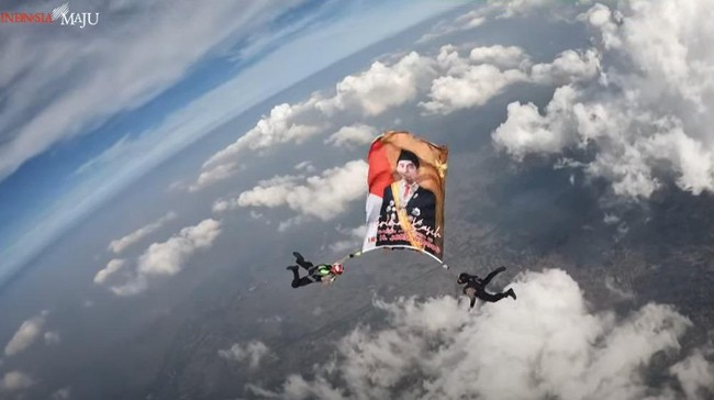 Foto kedua pemimpin itu kemudian berkibar di langit sambil dibawa oleh para penerjun payung. Selain itu, para penerjun payung juga membawa bendera satuan Polri.