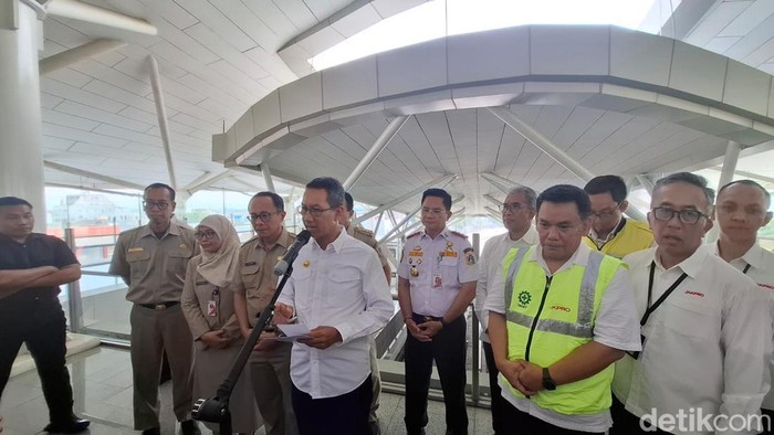 Pantauan detikcom di Stasiun LRT Velodrome, Jakarta Timur, Senin (14/10/2024), Heru Budi tampak didampingi Kepala Dinas Perhubungan DKI Jakarta Syafrin Liputo dan Dirut JakPro Iwan Takwin. Tampak pula Wali Kota Jakarta Timur Anwar dan jajaran pemprov lainnya.