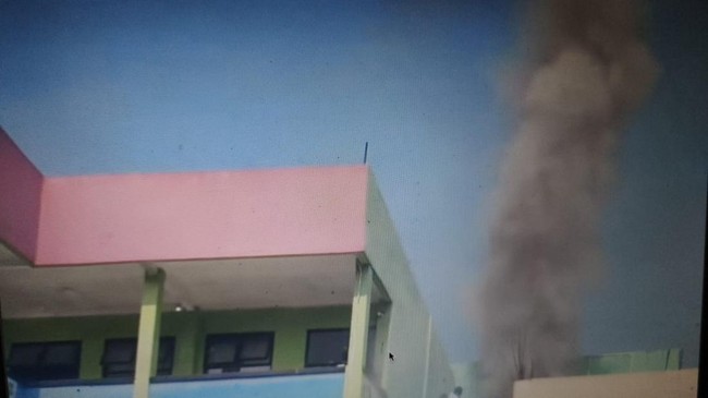 Asap putih cukup tebal mengepul saat api coba dipadamkan. Terlihat para pelajar keluar dari ruang kelas mereka dan berada di lapangan sekolah.