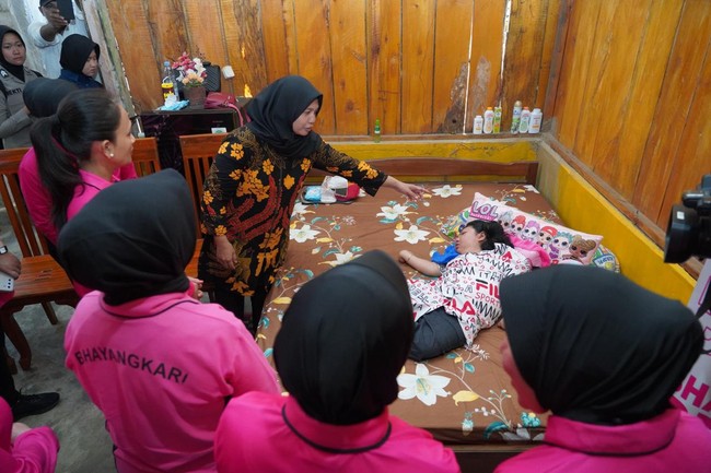 Ketua Umum Bhayangkari yang juga istri Kapolri, Juliati Sigit Prabowo, mengunjungi anggota Polsek Baruga, Kendari, Sulawesi Tenggara, Aiptu Heri Santoso dan anaknya Yunita Sulistyawati yang tengah terbaring sakit. Mereka menyerahkan bantuan untuk keluarga Aiptu Heri.