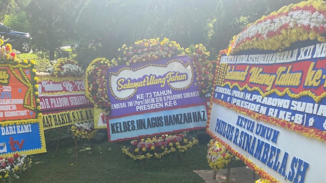 Presiden terpilih Prabowo Subianto berulang tahun ke-73 pada hari ini. Karangan bunga berjejer di kediamannya di Hambalang, Jawa Barat, sejak pagi ini.