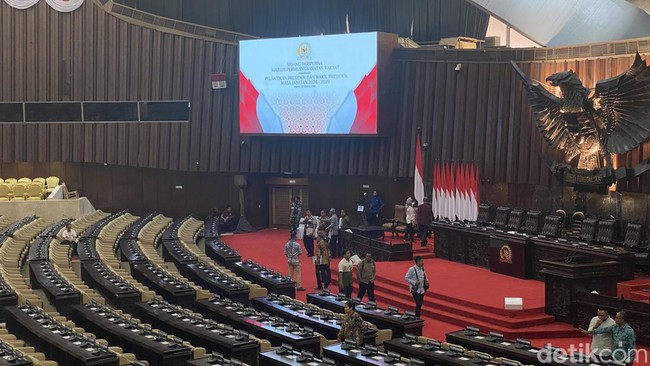Pantauan detikcom, Jumat (18/10/2024) pukul 15.00 WIB, ruang sidang pelantikan di gedung Nusantara MPR/DPR/DPD RI atau Gedung Kura-kura tampak telah bersolek. Layar besar yang tergantung di bagian depan ruangan telah menampilkan video grafis bertuliskan 'Sidang Paripurna Majelis Permusyawaratan Rakyat dalam rangka Pelantikan Presiden dan Wakil Presiden Masa Jabatan 2024-2029. Jakarta, 20 Oktober 2024'.