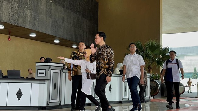 Gibran terlihat langsung memasuki ruang rapat paripurna di Gedung Kura-Kura. Dia terlihat sempat melambaikan tangan ke awak media.
