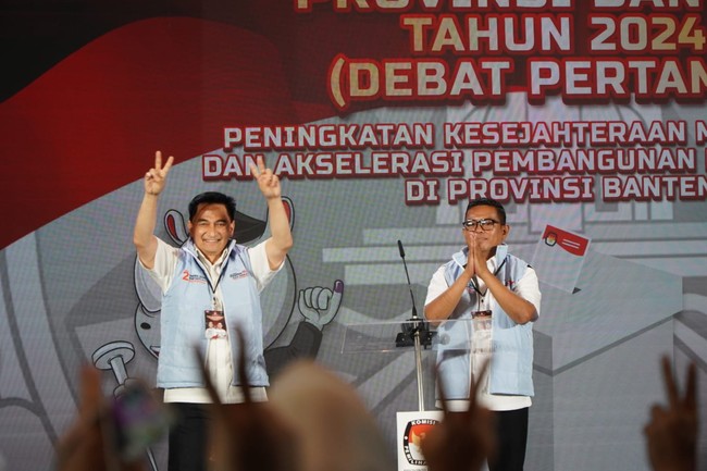 Pasangan Calon Gubernur dan Wakil Gubernur Banten nomor urut 02, Andra Soni-Dimyati Natakusumah menyampaikan visi misi mereka dalam debat perdana Pemilihan Gubernur Banten 2024.