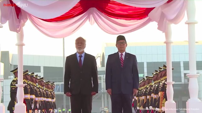 Lantas keduanya berdiri berdampingan saat lagu kebangsaan dari kedua negara dikumandangkan. Bendera Timor Leste dan Indonesia turut dikibarkan.
