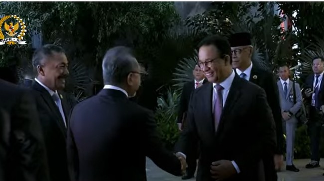 Anies sempat melambaikan tangan ke arah media. Anies kemudian memasuki gedung DPR/MPR untuk menyaksikan pelantikan Prabowo-Gibran.