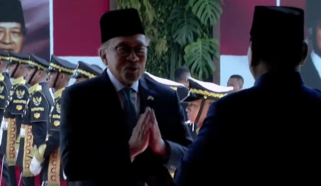 Setelah itu, giliran Perdana Menteri Malaysia Anwar Ibrahim tiba di MPR. Prabowo juga langsung menyalami Anwar Ibrahim.