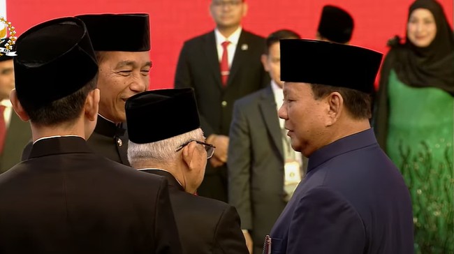 Presiden Joko Widodo (Jokowi) berbincang dengan Presiden terpilih, Prabowo Subianto, hingga Wapres Ma'ruf Amin sebelum berfoto di gedung MPR/DPR/DPD, Jakarta. Ketiganya tampak tertawa lepas saat berbincang bersama.
