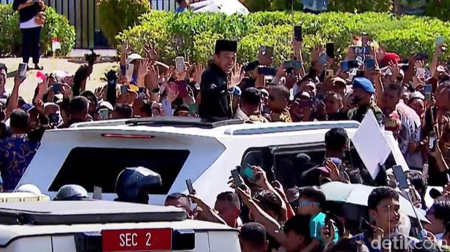 Sebelum masuk ke mobil, Jokowi sempat menyapa tamu undangan yang hadir di tenda. Tidak lama kemudian, Jokowi masuk kembali ke mobil.