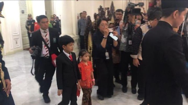 Gibran berjalan di belakang Ma'ruf. Gibran didampingi istrinya, Selvi Ananda, Jan Ethes, dan La Lembah Manah. Jan Ethes mengenakan jas hitam lengkap dengan dasi merah, sementara La Lembah Manah mengenakan kebaya merah.