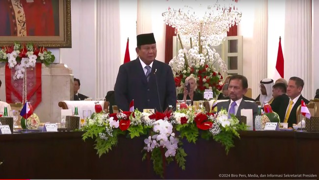 Prabowo mengenakan setelan jas hitam dengan peci hitam. Di samping kiri Prabowo, ada Sultan Hasanal Bolkiah dari Brunei Darussalam, dan di samping kanan Prabowo ada Presiden Filipina Ferdinand Marcos Jr. Para tamu negara duduk menyimak Prabowo memberi sambutan.
