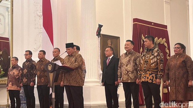 Sebelumnya, Prabowo juga telah mengumumkan nama-nama menteri di Kabinet Merah Putih. Mereka mengenakan batik berwarna cokelat.