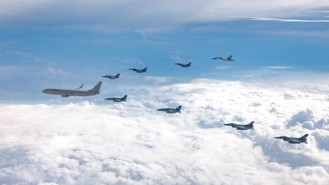 Penerbangan Presiden ke-7 RI Joko Widodo (Jokowi) ke Surakarta, Jawa Tengah dikawal oleh delapan pesawat jet tempur. Momen saat jet ini membentuk formasi diabadikan oleh sang 'naga'.