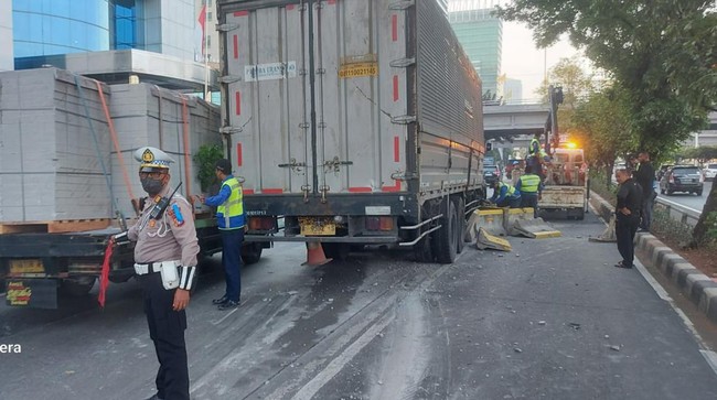 Informasi disampaikan akun X Traffic Management Center (TMC) Polda Metro Jaya, kecelakaan truk kontainer di Layang Gelong terjadi pukul 05.00 WIB pagi tadi. Saat ini petugas masih melakukan evakuasi.