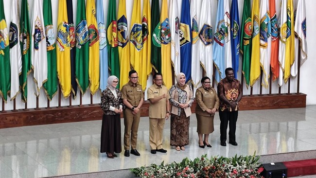 Jajaran Kemendagri juga turut melakukan foto bersama. Tito juga mengarahkan Ribka dan Bima untuk akses-akses gedung di lingkungan Kemendagri.