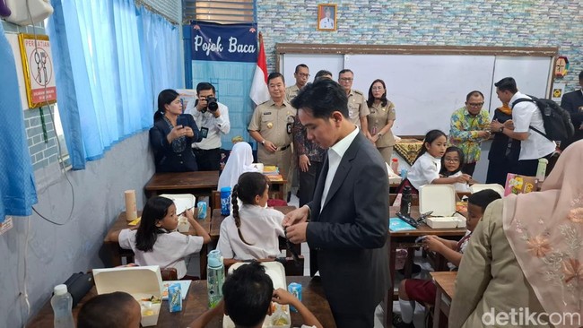 Wakil Presiden RI Gibran Rakabuming Raka meninjau uji coba Program Makan Bergizi Gratis di SDN 03 Menteng, Jakarta Pusat. Gibran sempat bertanya kepada Penjabat (Pj) Gubernur DKI Jakarta Teguh Setyabudi soal kandungan kalori hingga anggaran untuk uji coba makan bergizi gratis.