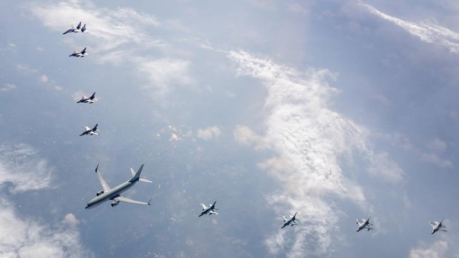 "Dalam pengawalan tersebut, TNI AU mengerahkan empat pesawat F-16 Fighting Falcon dari Skadron Udara 3 dan Skadron Udara 14, tiga pesawat T-50i Golden Eagle dari Skadron Udara 15, serta satu pesawat Sukhoi SU-30 MK2 dari Skadron Udara 11," jelasnya.