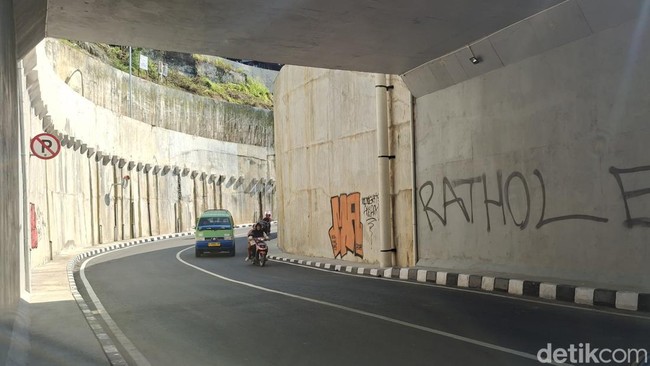 Pantauan detikcom, Rabu (23/10/2024), coretan liar terlihat mulai dari tembok penahan tebing menjelang terowongan underpass. Coretan tampak ditulis menggunakan cat semprot atau Pylox berwarna hitam.