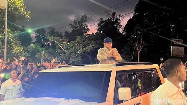 Prabowo dan rangkaian pun memperlambat laju kendaraan. Prabowo naik ke sunroof mobil untuk menyapa dengan melambaikan tangan ke warga.