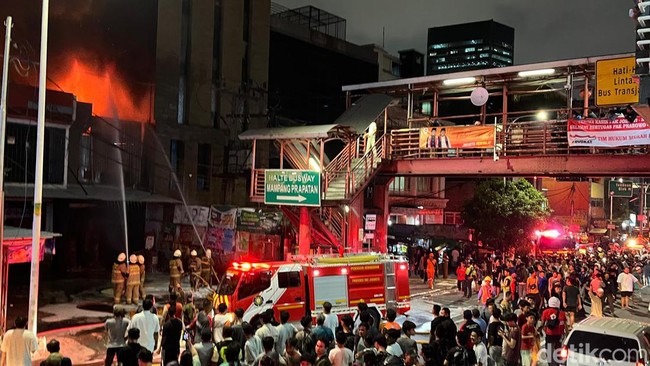 Kebakaran rumah toko (ruko) di Jalan Mampang Prapatan Raya, Jakarta Selatan (Jaksel), masih menyala. Pemadam kebakaran (damkar) masih berupaya memadamkan api.