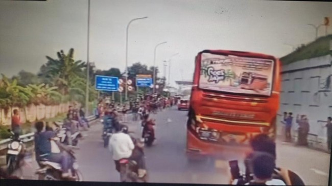 Dalam video yang beredar, terlihat ada bus berwarna oranye melaju dari arah Sawangan menuju pintu masuk Tol Sawangan. Terlihat warga sudah menunggu bus tersebut di pinggir jalan.