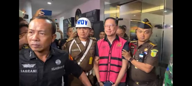 Selasa (29/10) tadi malam, pria bernama lengkap Thomas Trikasih Lembong itu mengenakan rompoi merah muda Kejagung. Tangannya diborgol dan digiring aparat ke mobil tahanan.