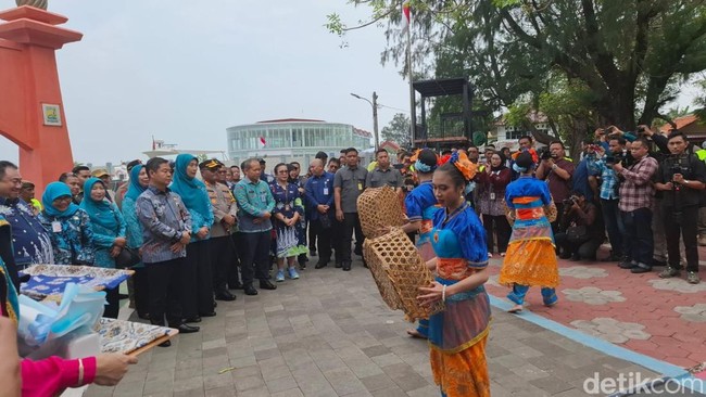 Pantauan detikcom di Pulau Pramuka, Kabupaten Kepulauan Seribu, Kamis (31/10/2024), Teguh Setyabudi, yang mengenakan batik biru, tiba pukul 09.00 WIB. Ia didampingi istri sekaligus Pj Ketua TP PKK, Ika Octaviana. Teguh disambut dengan tarian selamat datang tarian Babang.