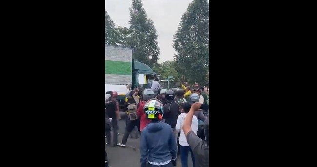 Tampak juga puluhan orang menaiki truk, menarik sang sopir keluar. Sopir truk lantas diamuk massa hingga terkapar.
