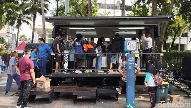 Pantauan detikcom di Bundaran HI, Minggu (3/11/2024) terlihat sebuah truk dapur lapangan milik Ditsamapta Polda Metro Jaya, terparkir di dekat pos polisi Bundaran HI. Truk dapur lapangan itu menyediakan menu sarapan gratis. Terlihat antrean warga mengular untuk mendapatkan sarapan gratis.