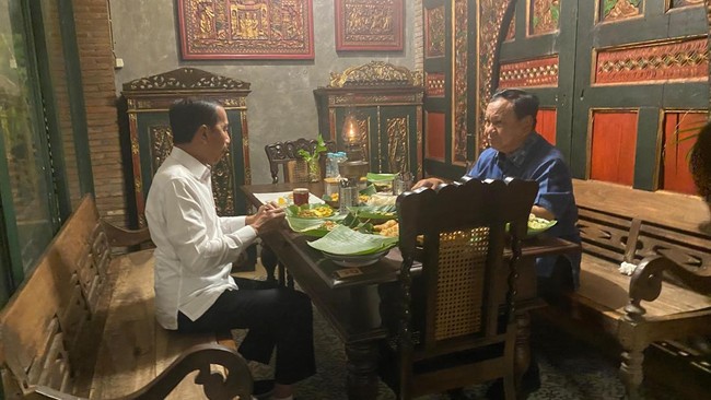Keduanya duduk berhadapan. Tampak hidangan tersaji di atas meja makan. Belum diketahui apa yang diperbincangkan Prabowo dan Jokowi.